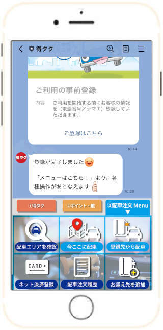 利用登録をすることで、LINE内に表示されるメニュー画面から、配車注文の項目をタップするとタクシーの配車を依頼できます。